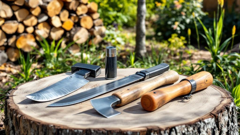 Regelmäßige Reinigung, gelegentliches Schleifen der Klinge, das Einölen von Metall und Holz sowie die Lagernutzung eines Klingenschutzes schützen das Werkzeug und verlängern seine Nutzungsdauer.