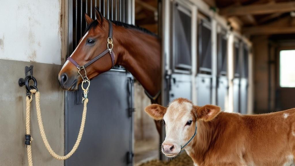 Ein Pferd am Putzplatz wird mit einem Panikhakenstrick an einem stabilen Stallring fixiert, während ein Kalb zur Klauenpflege ein breites, gepolstertes Halsband mit Schnellverschluss trägt. Bei Melkrindern gewährleisten Anbindeketten ein sicheres und schnelles Handling.