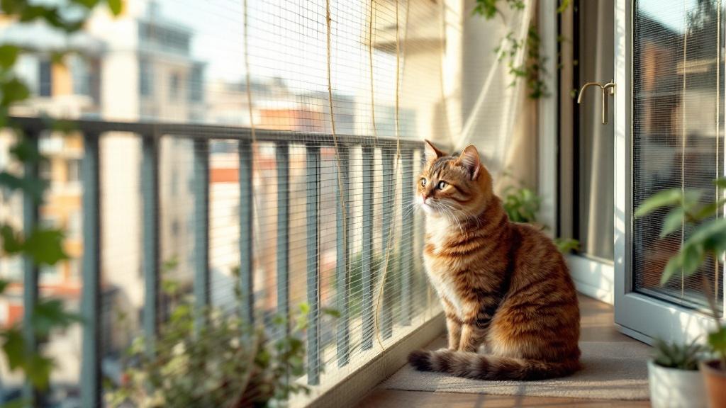 Beispielanwendung: Eine Familie mit städtischem Balkon installiert ein transparentes Katzennetz, damit ihre Katze nicht auf die Straße springt. Zusätzlich sichern sie die Fenster mit Steckgittern und nutzen eine Mikrochip-Katzenklappe am Haus, um kontrollierten Zugang zum Innenhof zu bieten.