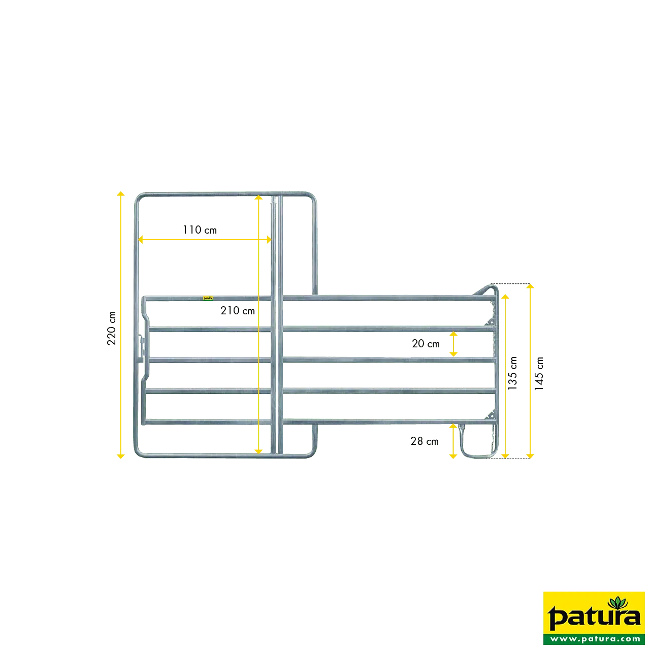 Das Panel-5 mit Tor bietet eine zuverlässige und flexible Abtrennung für die Tierhaltung, speziell geeignet für Kälber und Ponys. Mit einer Breite von 3,00 m und einer Höhe von 2,20 m ermöglicht das integrierte Tor einen schnellen Zugang zu abgetrennten Bereichen und sorgt für maximale Sicherheit und Komfort im Stall oder auf der Weide.