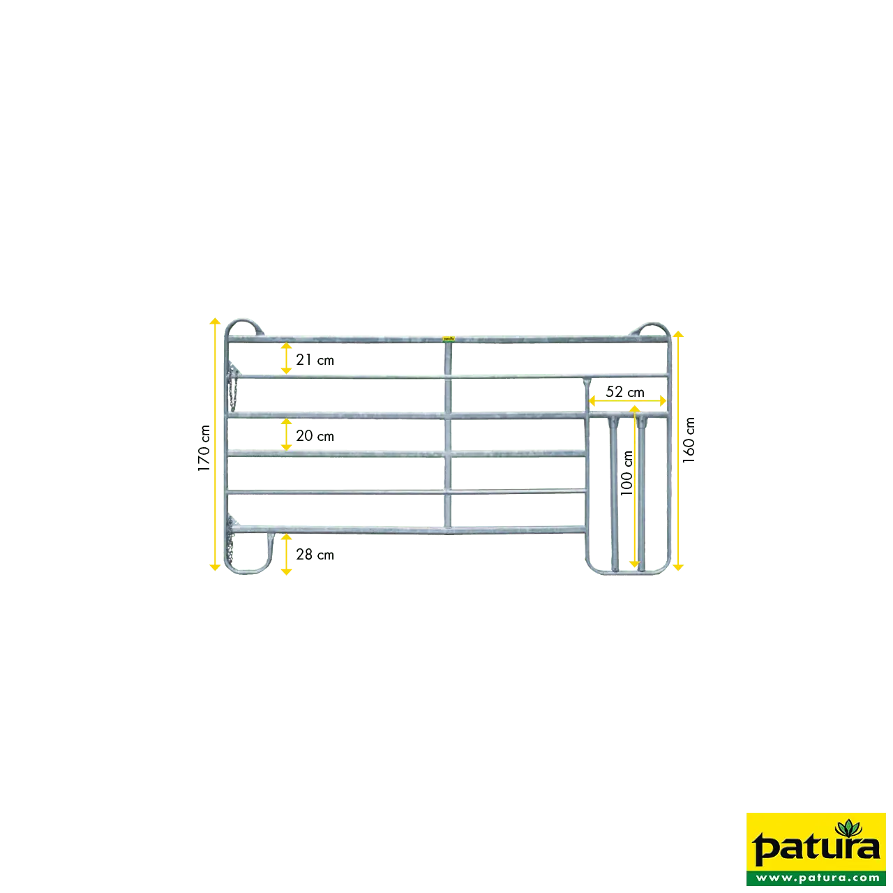 Das Panel-6 mit Kälberschlupf bietet eine zuverlässige Lösung, um auf der Weide einen abgetrennten Bereich speziell für Kälber einzurichten. Mit einer Länge von 3,00 m und einer Höhe von 1,70 m ist dieses Zaunelement optimal auf die Bedürfnisse in der Kälberhaltung abgestimmt und ermöglicht eine flexible Anpassung direkt vor Ort.