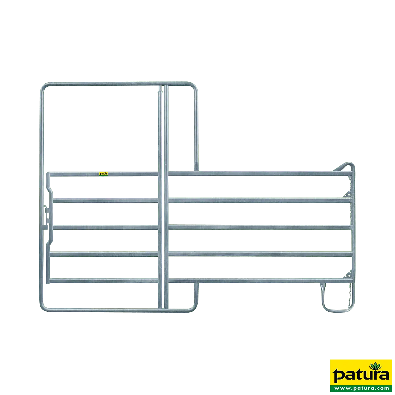 Das Panel-5 mit integriertem Tor bietet einen schnellen Zugang zu abgetrennten Bereichen und sorgt für höchste Sicherheit und Stabilität bei der Haltung von Kälbern und Ponys. Die robuste Konstruktion überzeugt durch ihr geringes Gewicht und ermöglicht eine einfache Verbindung selbst in unebenem Gelände.