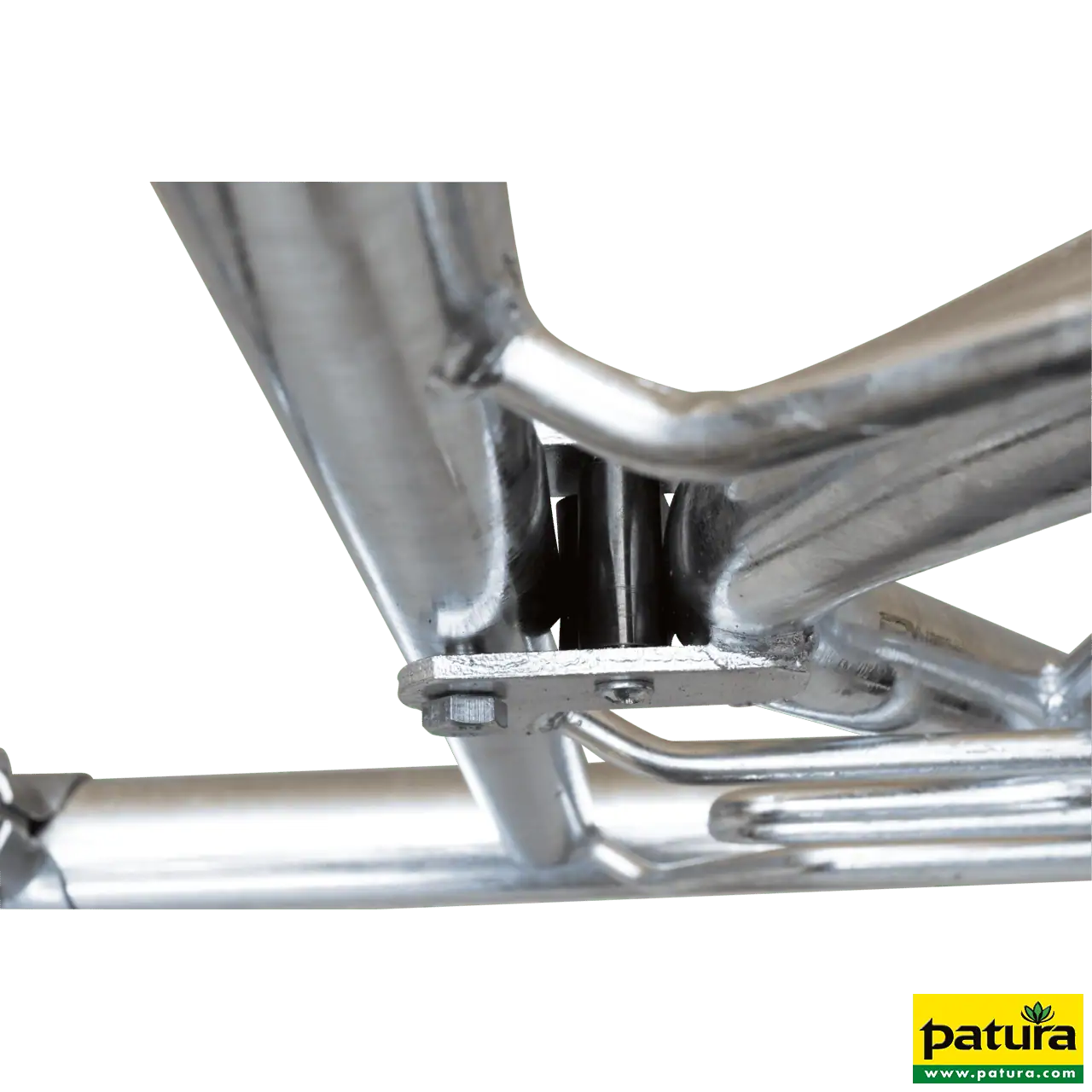 Leise Verriegelung durch einen kunststoffbeschichteten Riegelbolzen sorgt für stressfreie Stallruhe. Die verstellbare Halsweite ermöglicht eine optimale Anpassung an verschiedene Tiergrößen. Jeder Fressplatz ist einzeln absperrbar für maximale Flexibilität im Tiermanagement. Bei gerader Montage ist das Gitter schwenkbar – ab 3,00 m Länge wird hierfür ein Stützrad empfohlen.