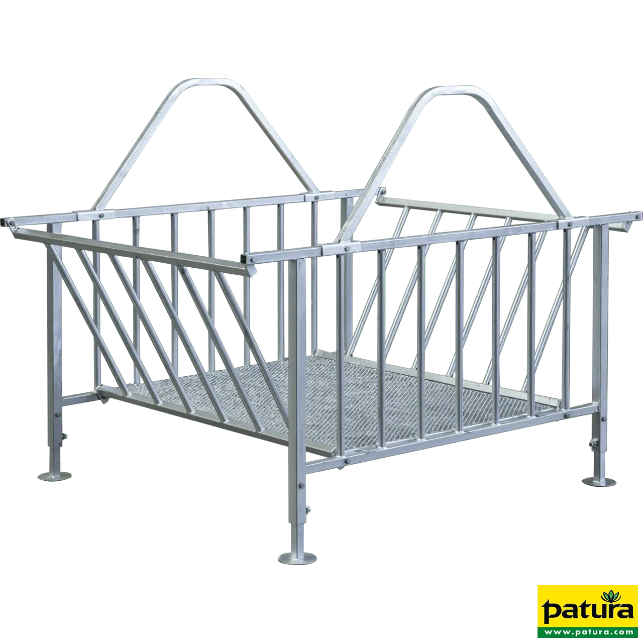 Die Viereckraufe Standard ermöglicht eine effiziente und saubere Fütterung auf der Weide. Mit 28 Fressöffnungen bietet sie ausreichend Platz für Schafe und reduziert Futterverluste durch ihren cleveren Aufbau. Die Raufe ist optimal für Heu-Rundballen bis Ø 1,80 m geeignet und lässt sich dank großzügiger Maße einfach mit dem Frontlader befüllen. Ein integrierter Gitterrost sorgt dafür, dass Staub und Futterreste durchfallen, sodass das Futter stets sauber bleibt und nicht auf dem Boden liegt.